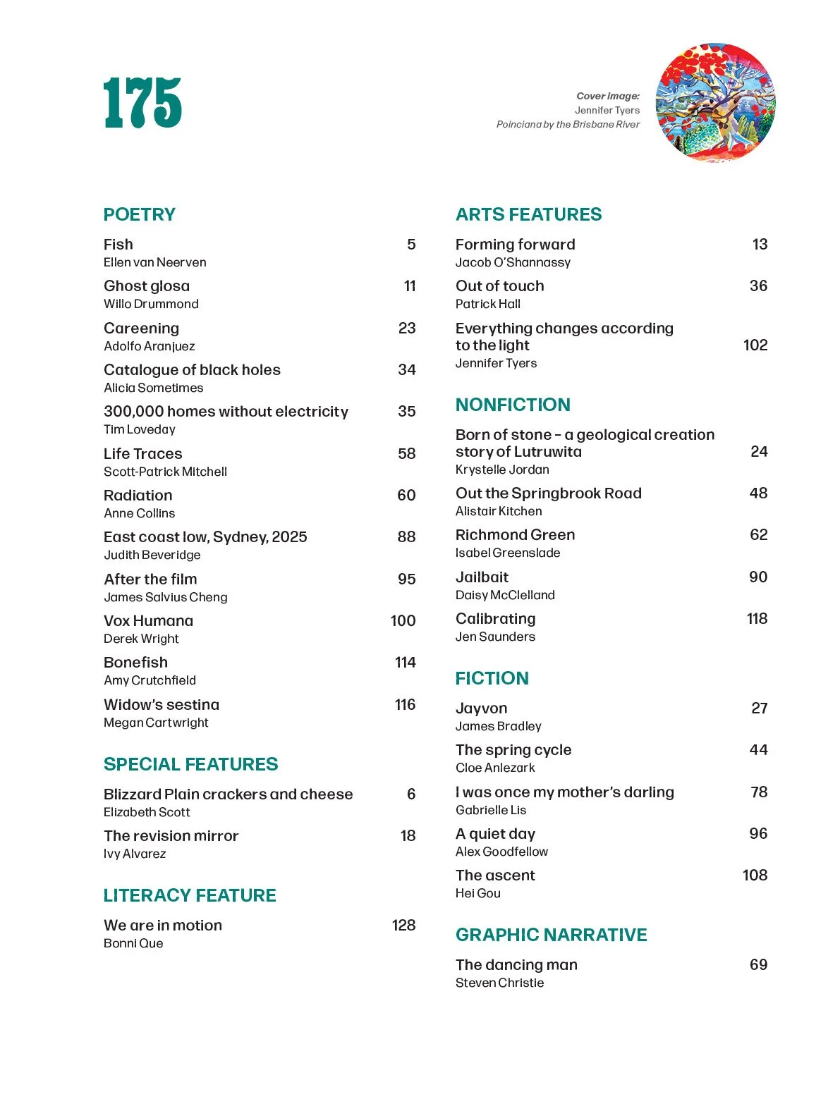 The poems in this issue arise both out of the everyday and the urgent. The strange wonders of driving ‘60 ks over’ (Aranjuez), the ‘curt contralto’ of a voice message prompt (Wright) or the ‘plastic dark’ outside a cinema (Cheng) all come alive here. Cartwright’s ‘Widow’s sestina’ strips a house down to its foundations, cannily using the repetitions of the form to enact a dismantling. Drummond’s ‘Ghost glosa’ is unsettled, attuned to ‘the shimmer/starburst, seed-puff, breath’. Mitchell’s ‘discarded remnants’ form ‘a monument’, and for Crutchfield the home becomes a space of hazard. Other poems reveal that the everyday and the urgent are one and the same, as when the weather turns. Beveridge writes of ‘Raptorial winds’, while Loveday states ‘the word apocalyptic loosens’ amid torrent. Meanwhile, illness transforms the everyday: Collins recounts the course of radiation, while Sometimes summons astronomy – the ‘body become nebulae’ – in treatment. Meanwhile van Neerven takes us to the semantic brink as all their human actions – mundane, extraordinary – transform to become fishlike.